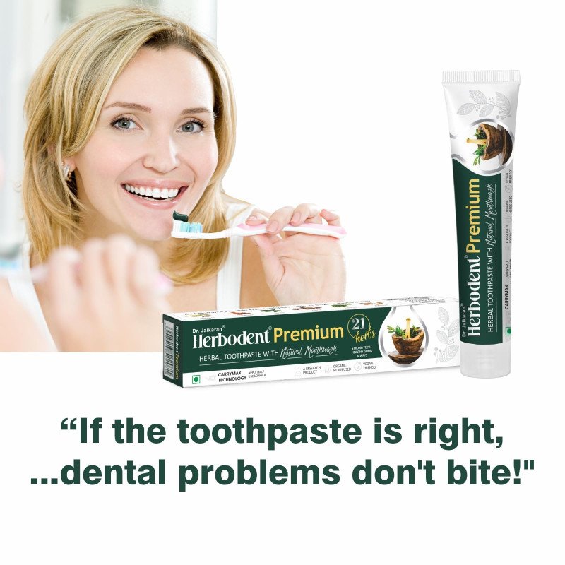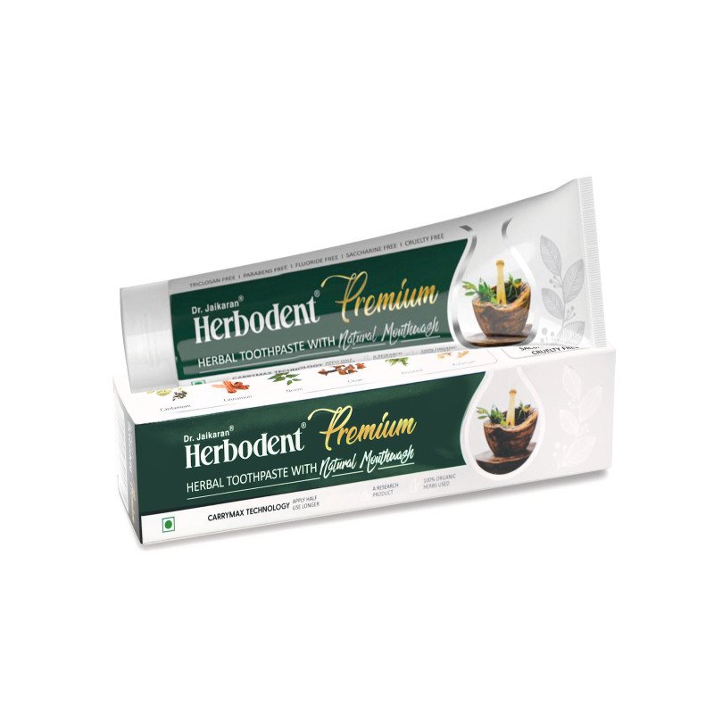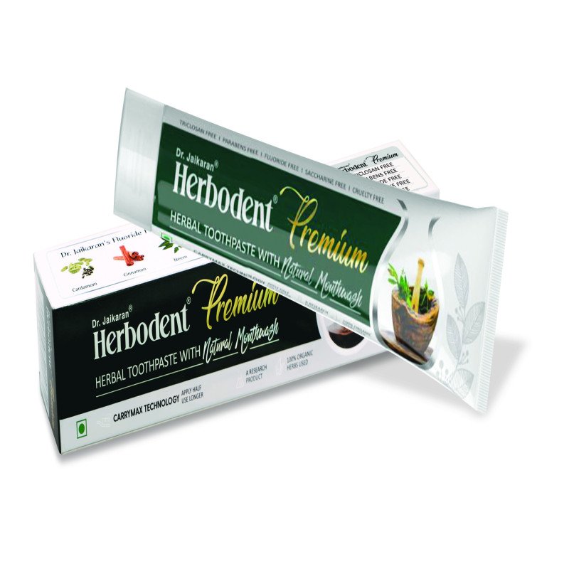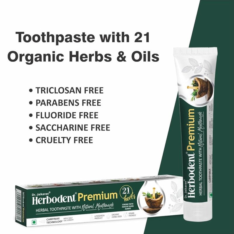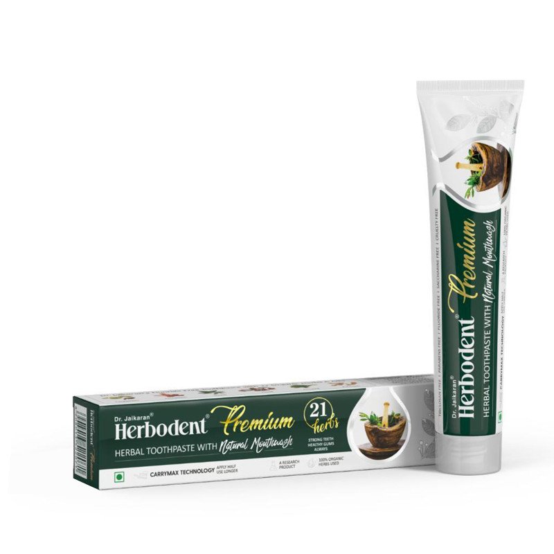 Herbodent PREMIUM by Dr. Jaikaran Life Sciences is a specially formulated herbal toothpaste enriched with 21 organic herbs and natural oils. Using advanced Carrymax Technology, it combines the power of Ayurveda with modern research to deliver complete dental care.